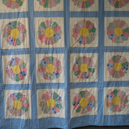 The antique dresden plate blocks were given to the LCM quilt group by an anonymous donor. Our Quilt group added the sashing, backing and binding.