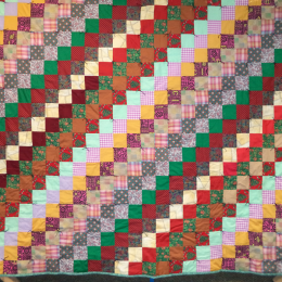 Beverly Jones of Red Cloud, NE, pieced the top of small squares sewn in diagonal row. She gave it to Rose Frey, a friend who has a home in Red Cloud and also an apartment at Elmwood Tower in Omaha. Rose passed it on to Eva Swanson, who passed it on to the Augustana quilting group. Pat Lundahl and Janette Petersen finished it. Put put it together with batting and hand sewed the binding and Janelle tied it.