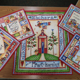 This is a set of five different wall hangings, each emphasizing a teacher's love of teaching and for her students. Each of the wall hangings has a casing for easy insertion of a rod for hanging. St. Paul's Sewing Circle, which includes many retired teachers, thinks this would be a perfect gift for a teacher.