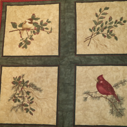 This Christmas table topper features 4 panels of winter birds and holly for a winter theme. The mottled tan background emphasized the 4 panels to make a striking addition to a Christmas tabletop. Brenda Hemje, who loves the Christmas season, pieced and machine quilted this piece.