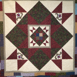 This quilt was made with Buggy Barn fabrics designed by Buggy Barn fabrics designed by Buggy Barn sisters Pam Soliday and Janet Rae Westbitt outside Reardan, WA. The pattern was designed by Heather Mulder Peterson of Inka's Treasures of Minnesota. Quilt made and quilted by Twyla Voldeth, Brandon SD. Made approx. 2009.